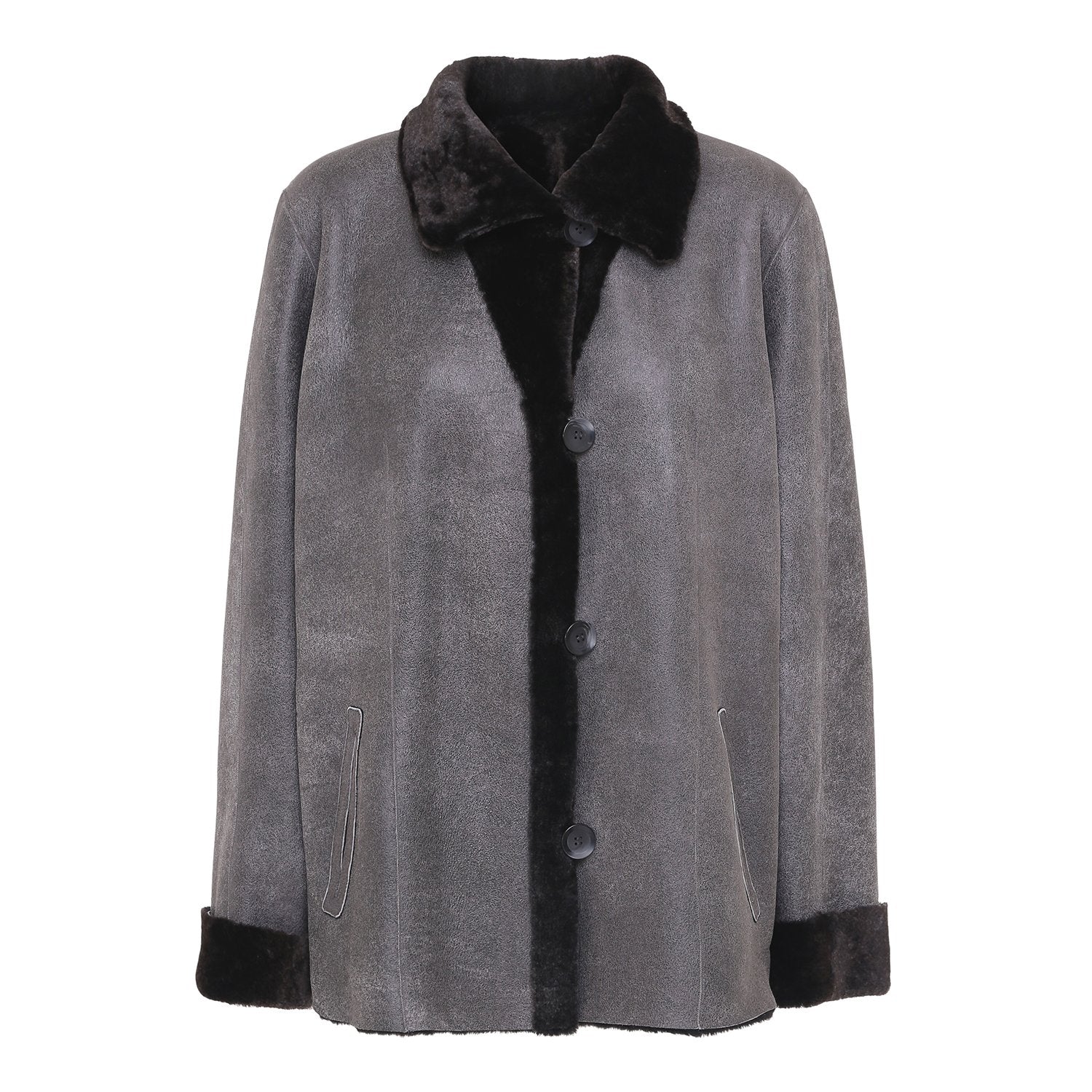Grå rulamsjakke casual vendbar. Jakken er 67 cm lang og vendbar. På billedet ser du den udvendige læderside i en iris-grå nuance. Hvis du vender jakken om er den brun-grå på pelssiden - se foto til højre. Fordelen ved denne jakke er, at du kan vælge den bløde side indad og det føles blødt og lunt at have den på. Lædersiden vil så være ud af, som er meget slidstærkt. Du kan også vælge at lade den bløde side være ud af og gå med den som en pels. Denne rulamsjakke har en fantastisk pasform, som passer de fleste.