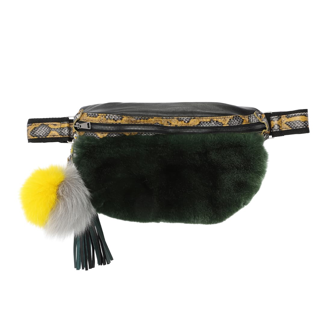 Grøn bælte-taske skind læder. Bæltetaske i fantastisk flot finish med mange detaljer. Bælte tasken åbnes foroven med lynlås. Tasken er foret indvendig. Remmen kan justeres i længden. Selve tasken er af italiensk kernelæder i en flot brun farve. Pelsbesætningen på fronten af tasken er af spansk merino-skind i grøn. Læderforstærkningerne er i et flot mønster, som giver tasken et fantastisk outfit. Som en ekstra detalje er der en grå og gul pels-kugle fra Saga Fur hæftet fast, som kan bruges som eksklusiv nøglering.