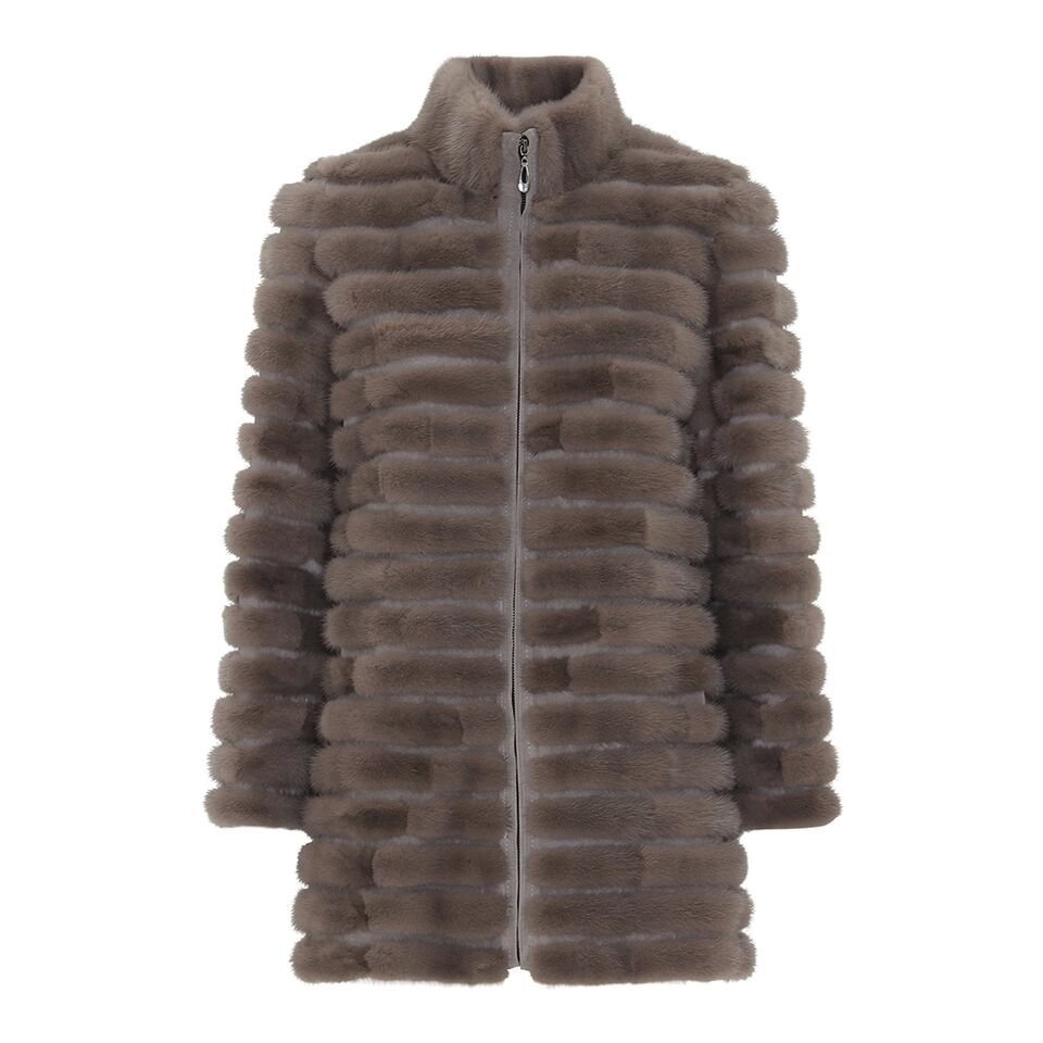 Minkjakke galoneret lynlås grå. Lækket let minkjakke, som både kan bruges til hverdag og fest. Minkjakken har en 6 cm høj krave i grå mink. Pelsen er 90 cm lang, og rummelig i modellen. Jakken er foret med sort uld-for og har to sidelommer.