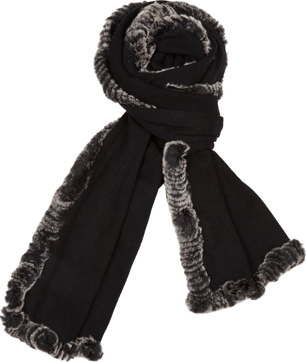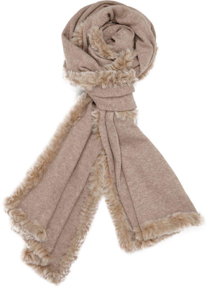 Scarlet er et langt og bredt halstørklæde, der primært består af uld. Langs kanten har halstørklædet en smal kant af pels hele vejen rundt.