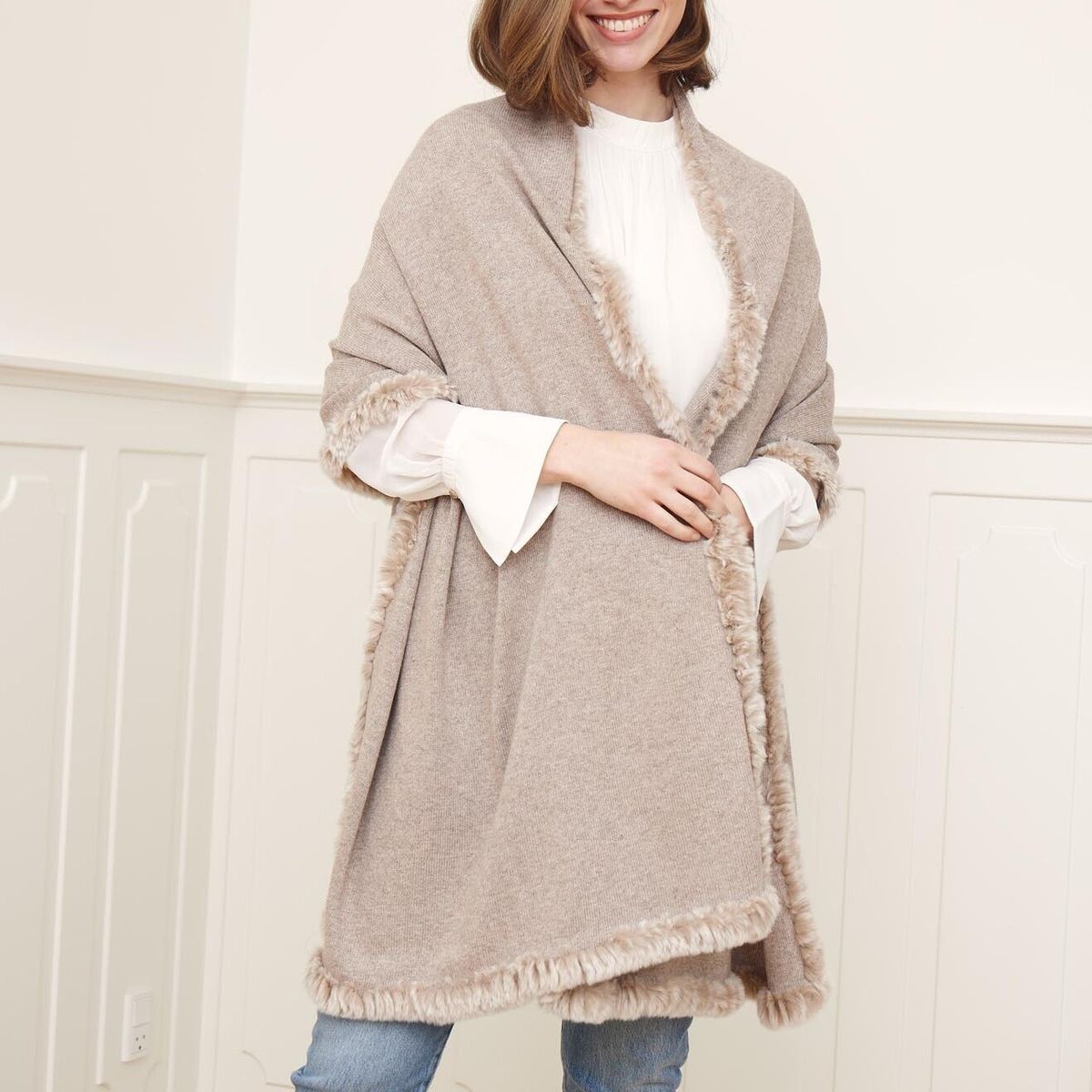 Halstørklædet fylder ikke ret meget, da den har en lille pelskant. Derfor kan den nemt være under jakken eller bruges som et let halstørklæde til indendørs brug.