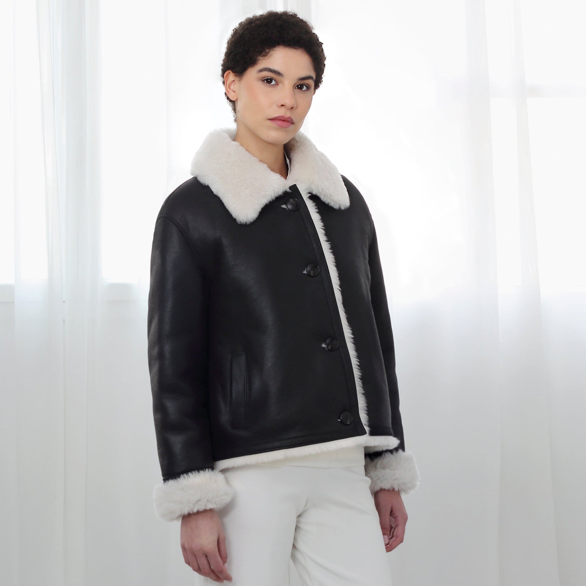 Rulamsjakke krave i kontrastfarve. Kort model med knap-åbning. Ærmer kan reguleres i længde. Meget smart model.