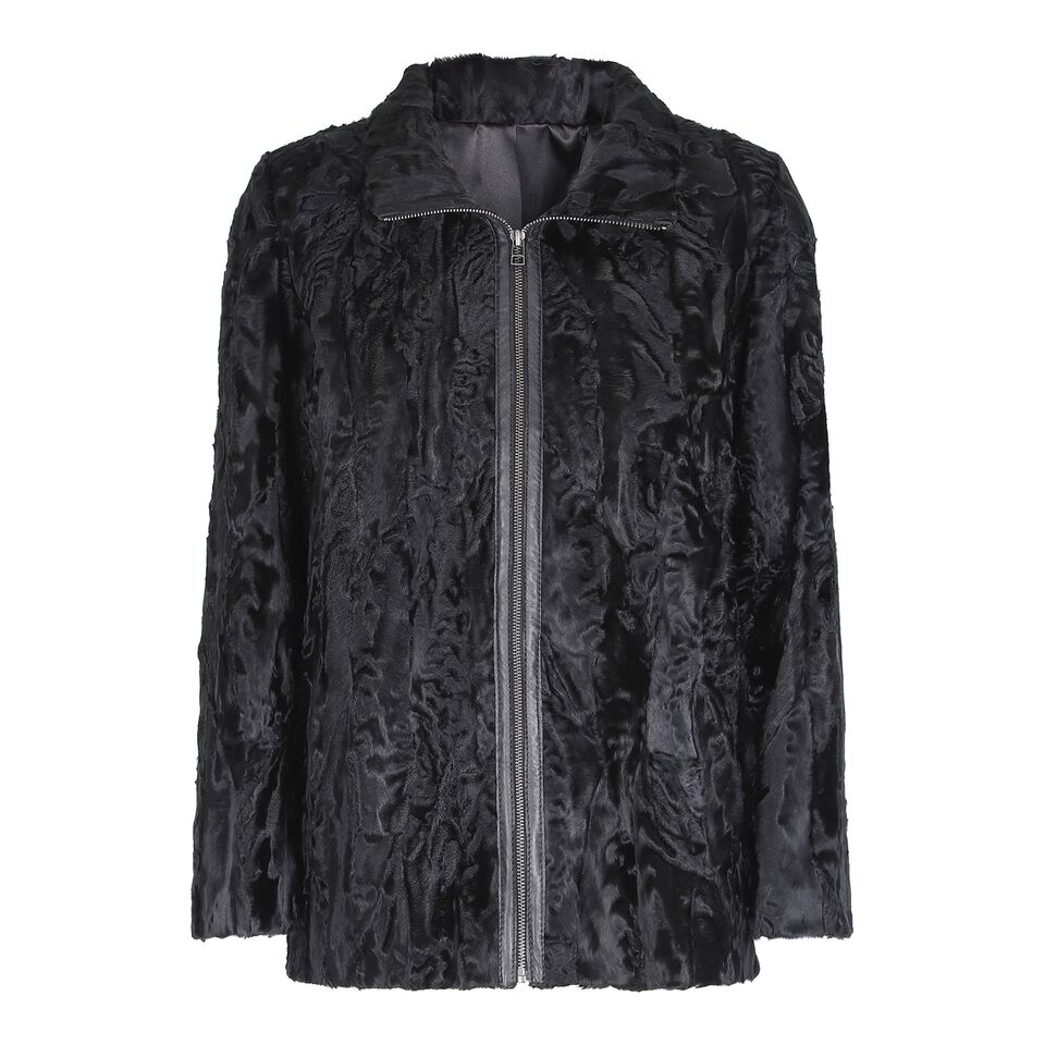 Swakarajakke sort med lynlås lavet af vores egne skind. \nElegant og praktisk jakke med 8 cm høj krave og to sidelommer - 68 cm lang. Jakken er foret og meget slidstærk. Denne jakke kan du både bruge til selskabs- og afslappet brug. Et rigtigt godt valg, hvis du vil have en pelsjakke der holder i mange år.