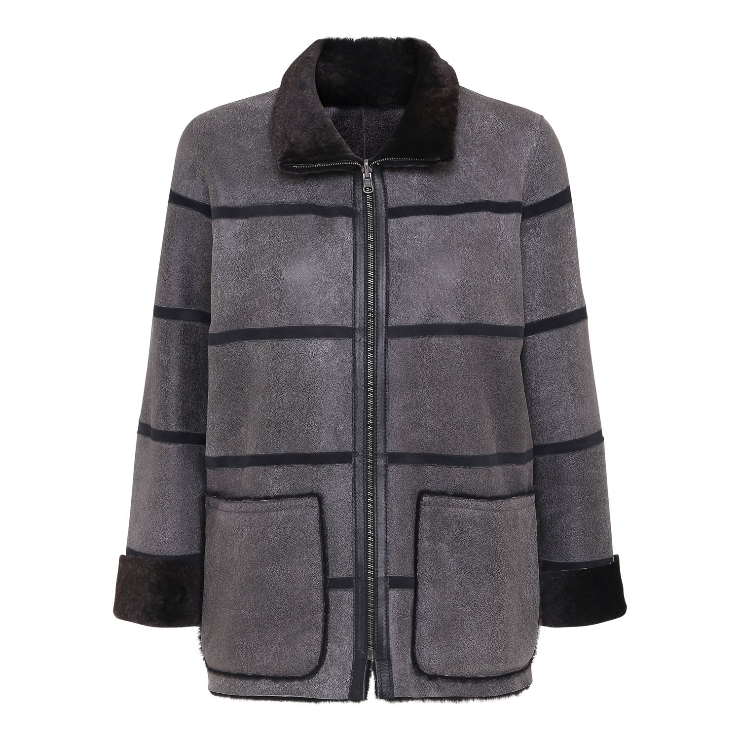 Vendbar indvendig rulamsjakke brun. Jakken er skåret og syet med striber på tværs og er vendbar. På billedet ser du den indvendige side som er lædersiden i iris-grå og sort. Hvis du vender jakken om er det pels-siden, som er brun-grå - foto til højre. Fordelen ved denne jakke er, at du kan vælge den bløde side indad og det føles blødt og lunt at have den på. Lædersiden vil så være ud af, som er meget slidstærkt. Du kan også vælge at lade den bløde side være ud af og gå med den som en pels. Denne rulamsjakke er 67 cm lang, og har et "stramt look", som gør jakken repræsentativ. De gængse størrelser på lager, men vi kan levere alle størrelser på ca. 3 uger.